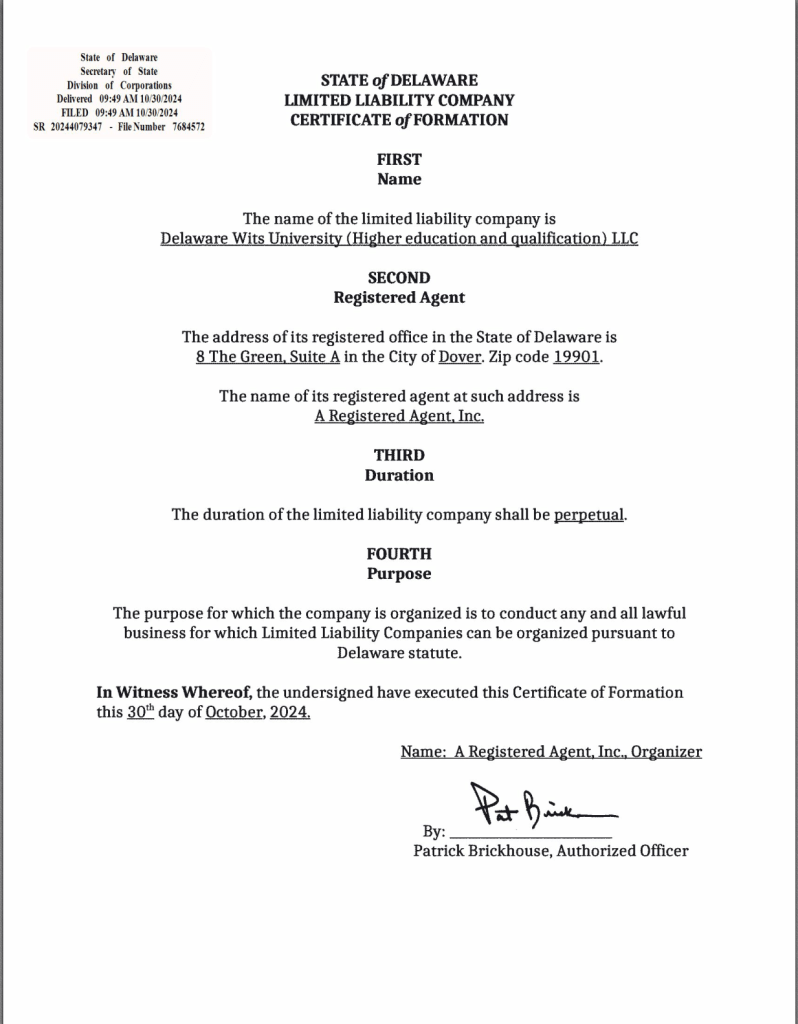 Delaware Wits University (Higher Education and Qualification) LLC